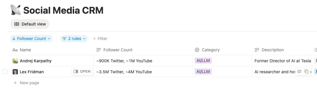 To stay on top of the news I trust I pulled together a list of key tech influencers; 35 voices in engineering leadership, AI, and DevOps. People like Gergely Orosz, Kelsey Hightower, Charity Majors, and Simon Willison. I then tasked Lionel with processing that jumble of markdown files to turn them into a Social Media CRM in Notion; and asked them to find all the social media handles and their face image for the db row icons. Each record has a profile photo icon (via unavatar.io), follower counts, a description, how they built their audience, verified Bluesky and Substack URLs, and an IsFollowed flag.